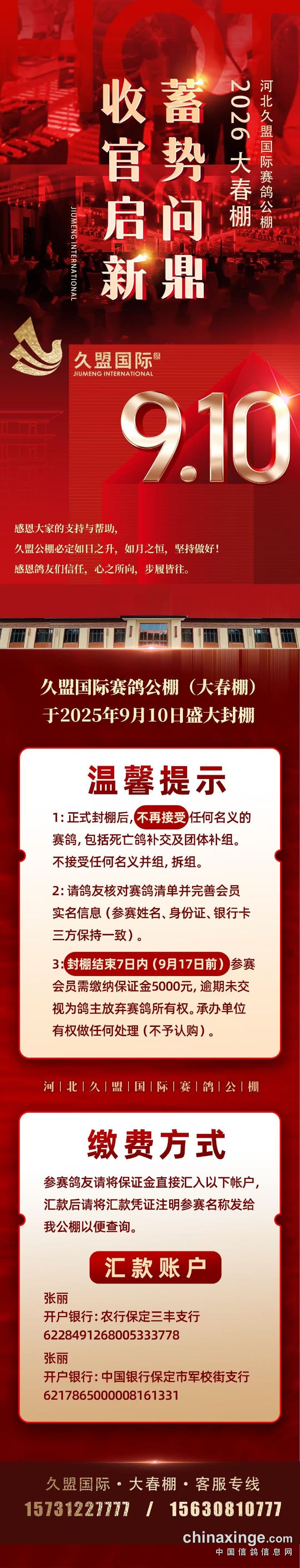 河北久盟国际赛鸽公棚(春棚)缴费探视通知