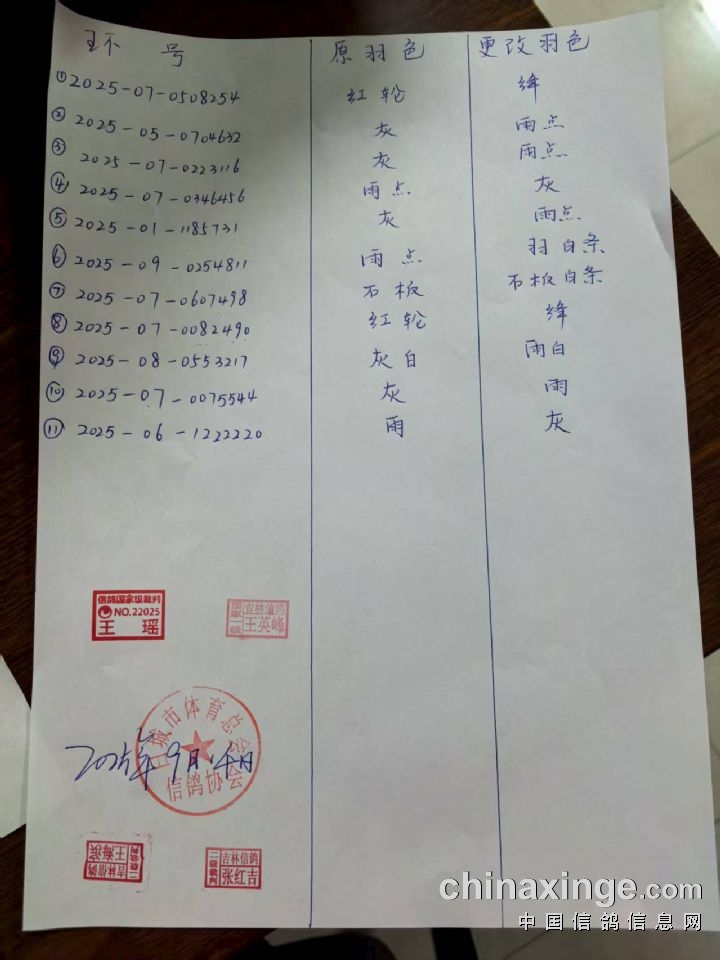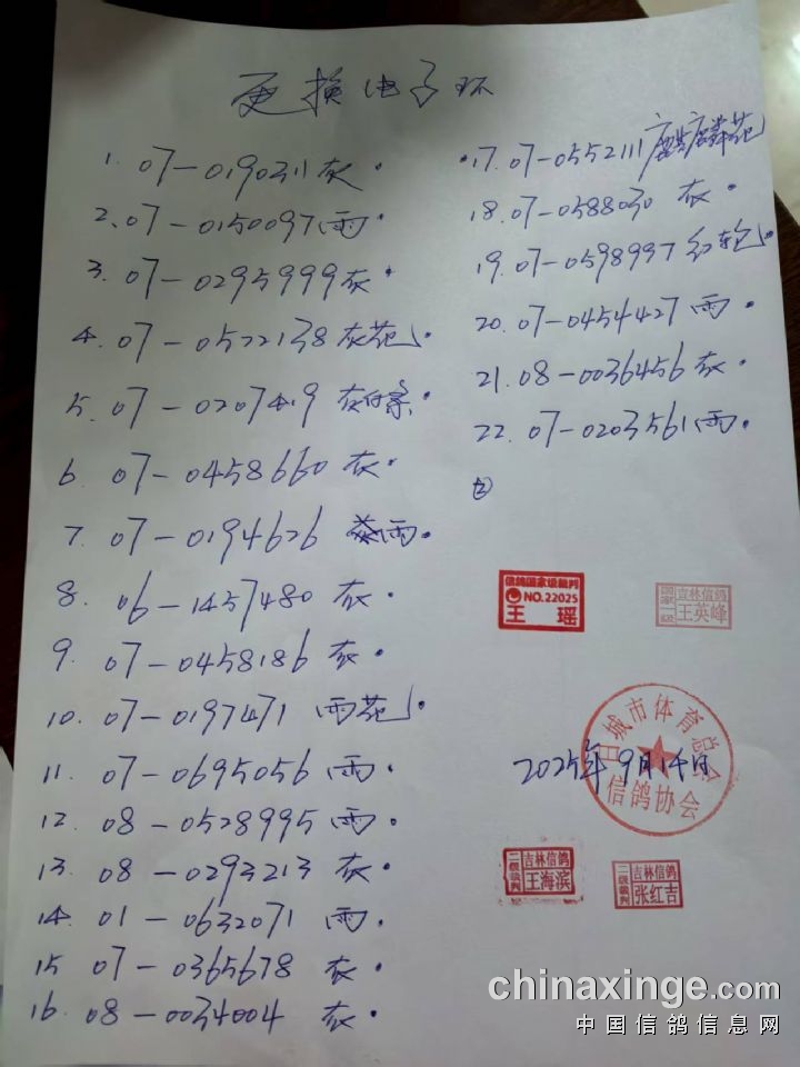 大安信和100公里收费站集鸽过程中修改羽色及对电子环不灵敏进行更换名单
