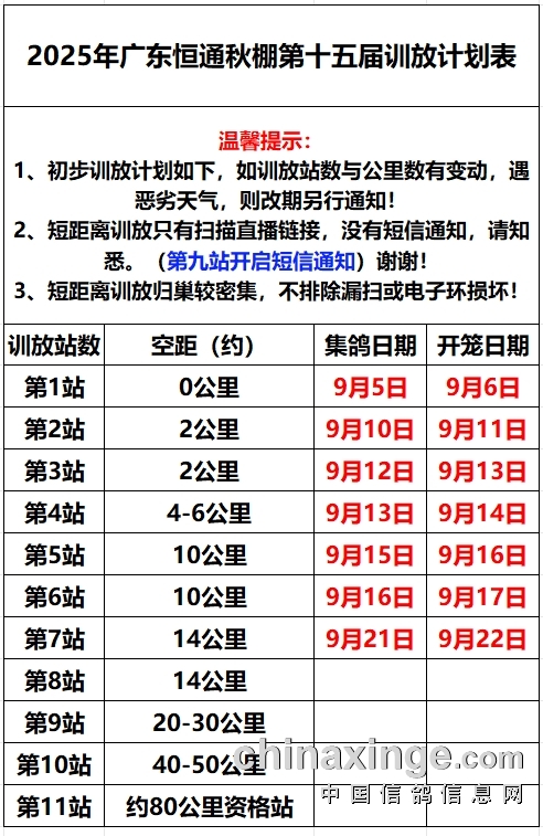 广东恒通(秋棚)第七站14公里训放定于2025年9月21日晚集鸽,9月22日早上开笼!如遇恶劣天气,则改期另行通知!
