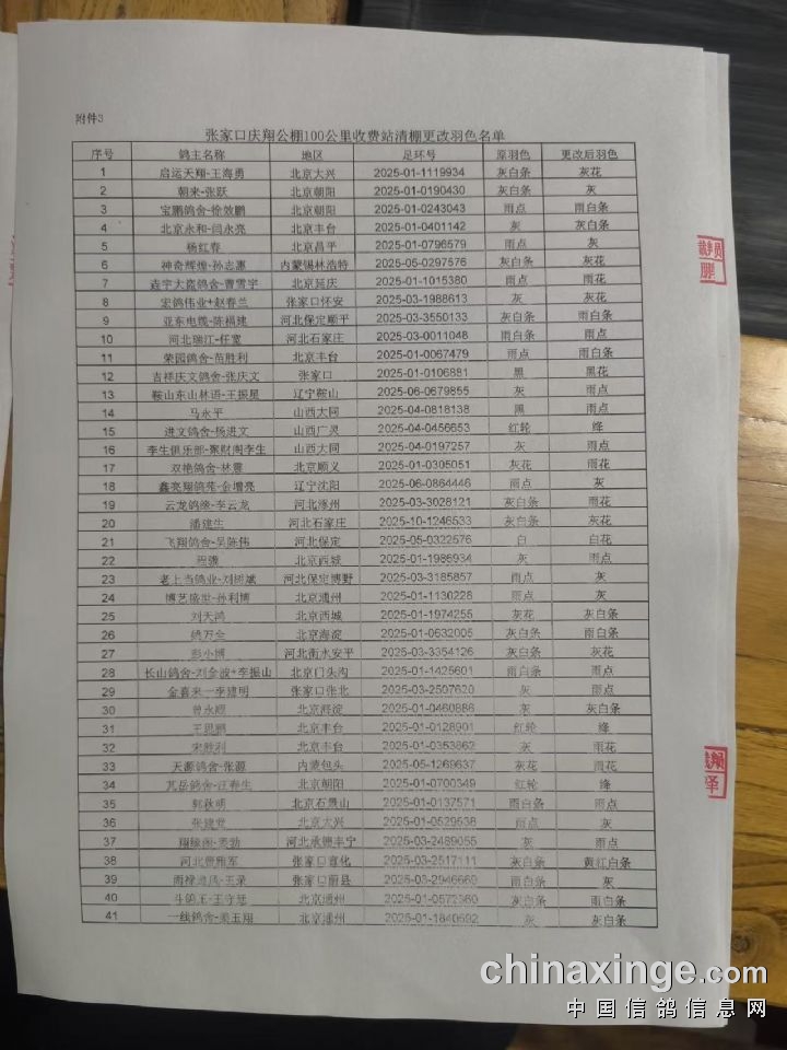 张家口庆翔公棚100公里收费站清棚更改羽色名单