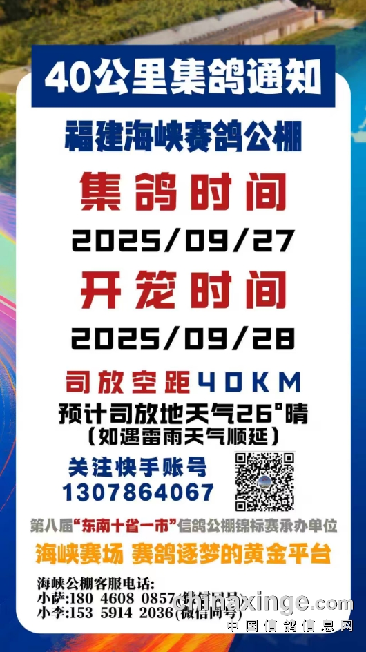 福建海峡赛鸽公棚定于2025年9月27日晚集鸽,9月28日进行第十站(40公里)路训。届时将开启“快手直播”(快手直播房间名:福建海峡赛鸽公棚,快手号:1307864067)、归巢成绩实时在线。敬请会员关注公棚网站及微信群通知!