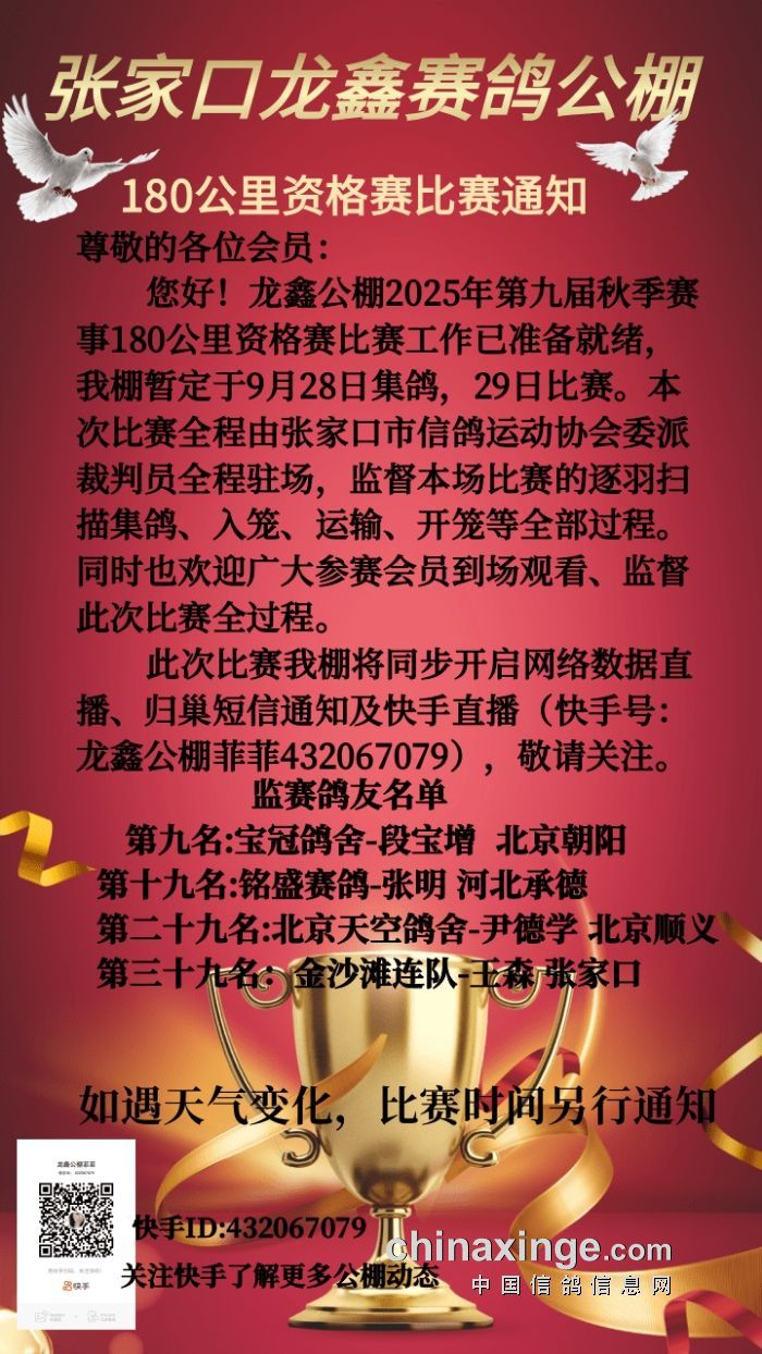 张家口龙鑫公棚300公里热身赛开笼图片及直播链接