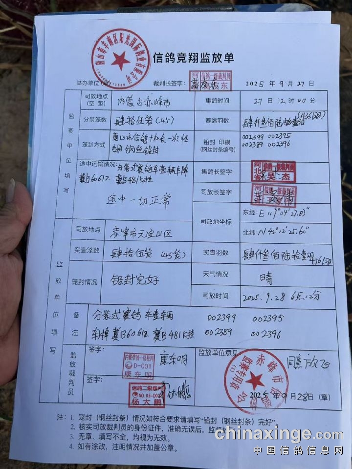 (秋)2025年秋季唐山阳光寄养棚多关鸽王大赛第二关(巴林左旗)铅封鸽笼销毁暗章