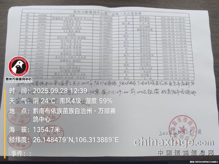 贵州万顺公棚:2025年秋赛第四关总决赛集鸽清单