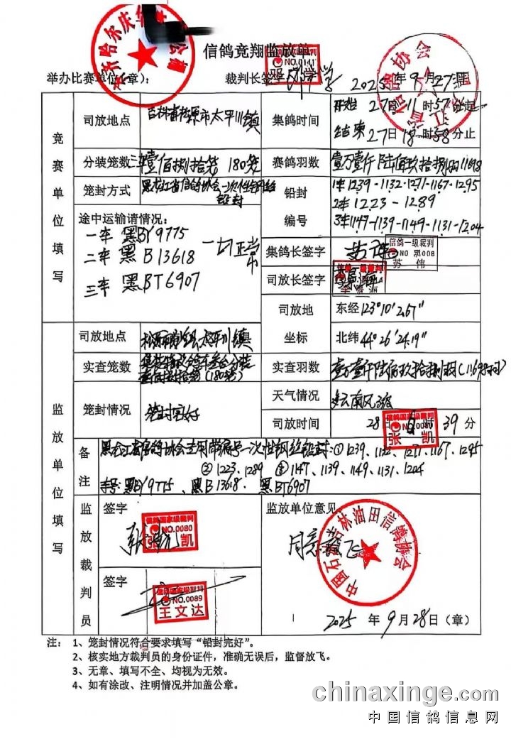 齐齐哈尔庆华公棚300公里信鸽协会监放单