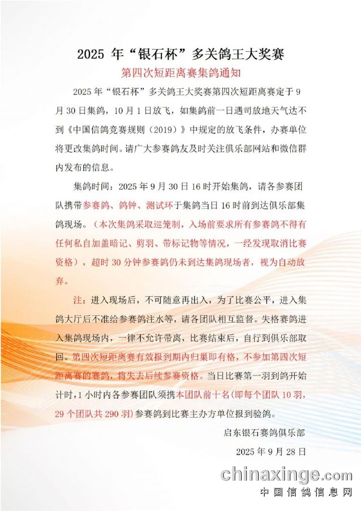 2025年"银石杯"多关鸽王大奖赛第四次短距离赛集鸽通知