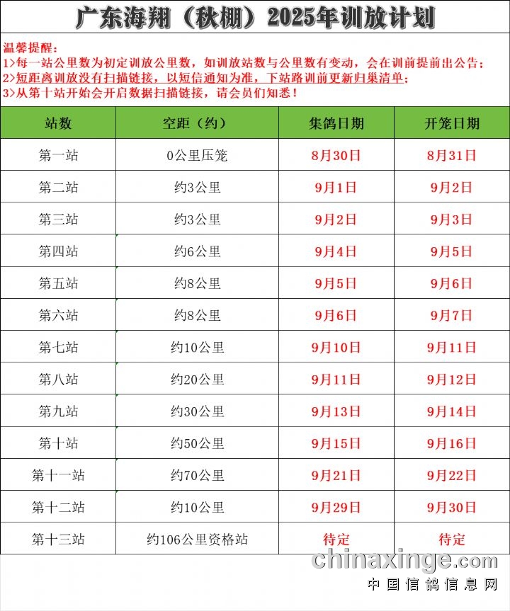 为保证参赛小将的竞翔状态,广东海翔(秋棚)第十二站10公里复训定于2025年9月29日晚集鸽,9月30日早上开笼!如遇恶劣天气,则改期另行通知!