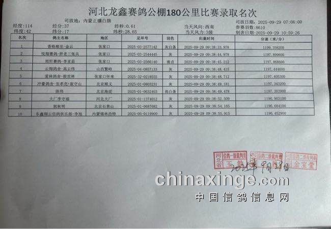 张家口龙鑫公棚180公里前10名比赛录取名次