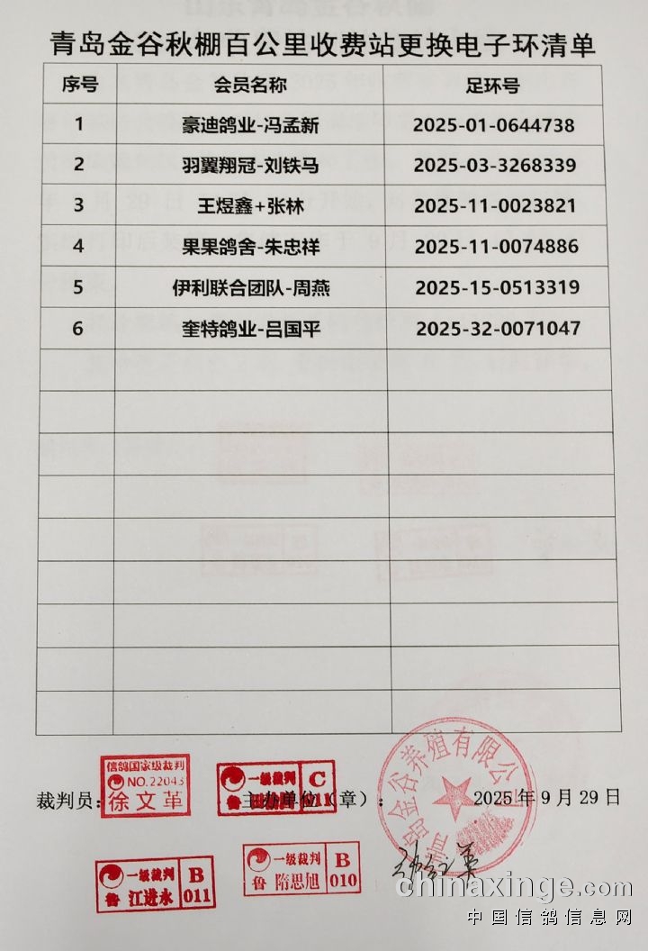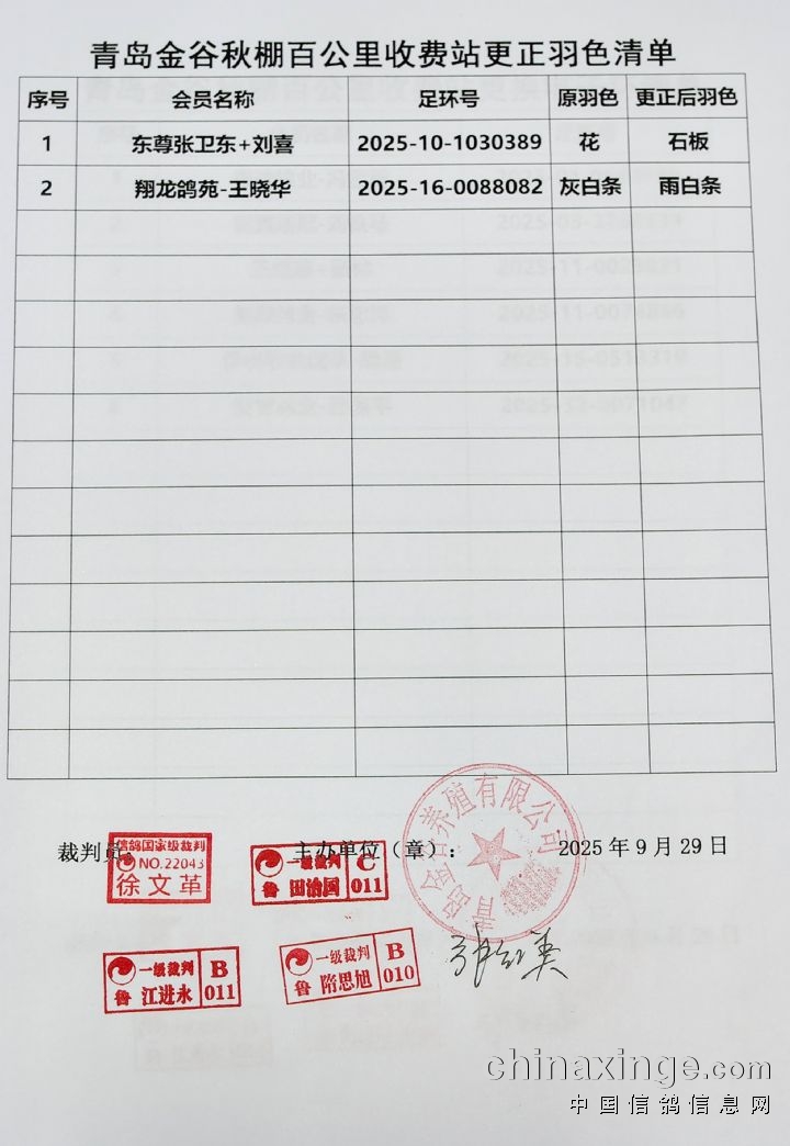 青岛金谷秋棚 山东省外获奖鸽及迟归鸽发回公告