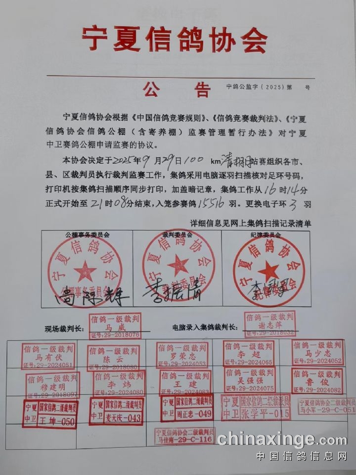 • 宁夏中卫赛鸽公棚520公里第三关奖金领取通知 (2025-11-20 17:10:31)