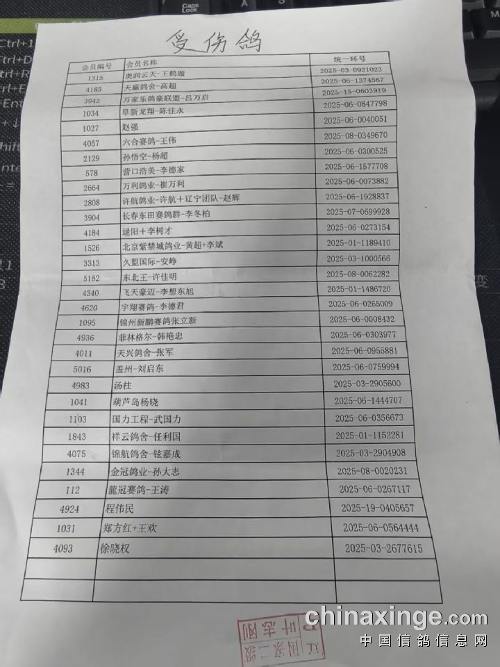 辽宁长城顺翔赛鸽公棚未缴纳预定金名单(名下参赛鸽全部挑出)