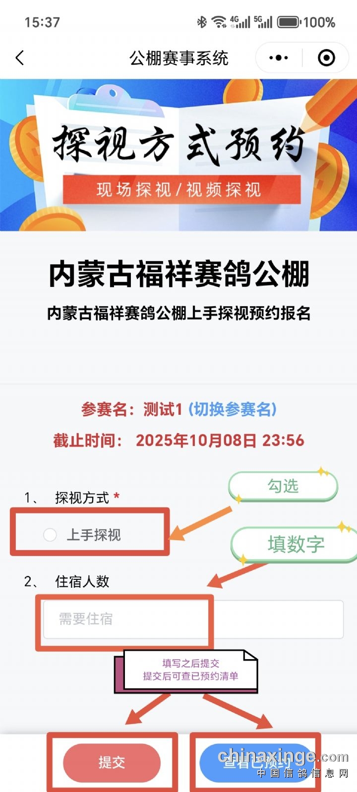 二、预约现场探视报名方式:会员可通过公棚以微信预约、手机自行预约等进行探视报名,报名时请提供电话、参赛名进行登记,并及时在福祥公棚网站核查是否预约成功。