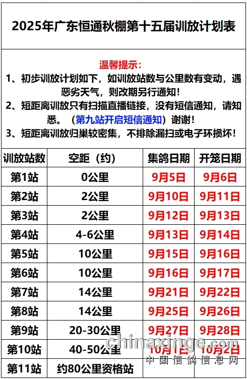 广东恒通(秋棚)第十站40-50公里训放定于2025年10月1日晚集鸽,10月2日早上开笼!如遇恶劣天气,则改期另行通知!