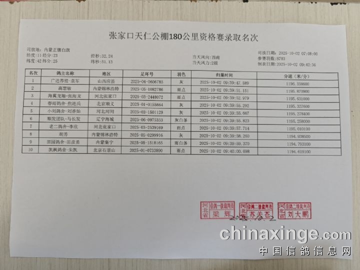 张家口天仁公棚180公里资格赛前10名成绩单