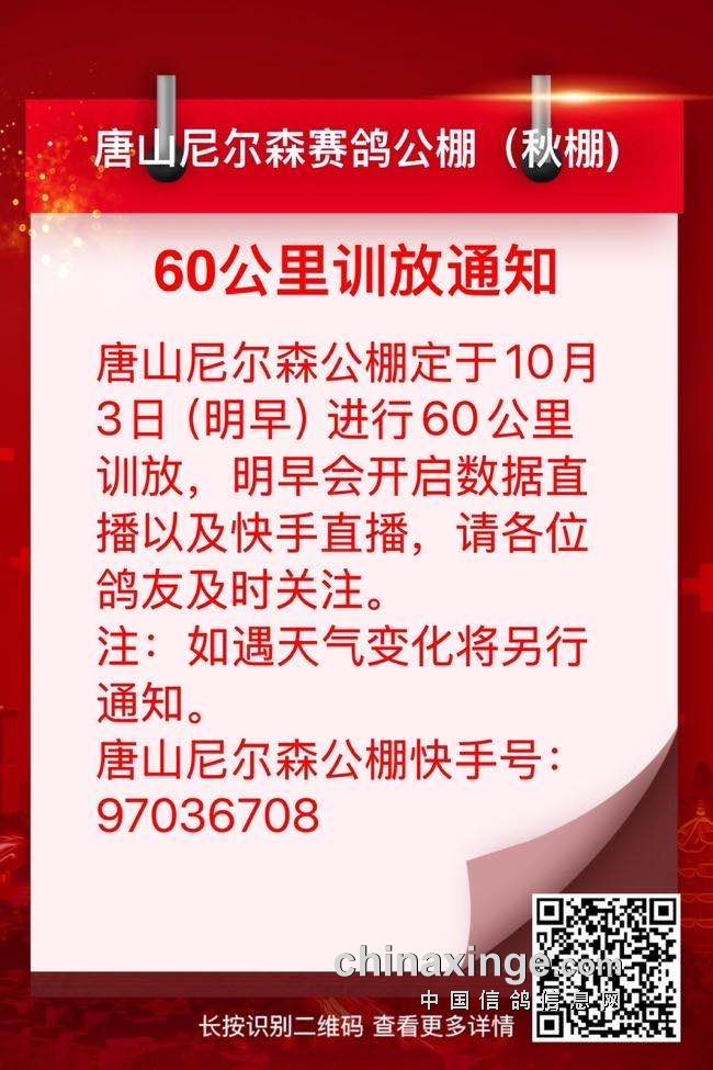唐山尼尔森公棚60公里训放通知