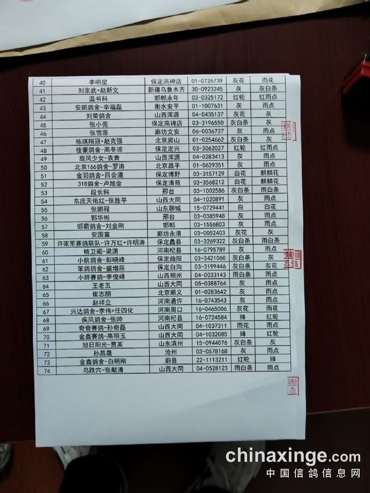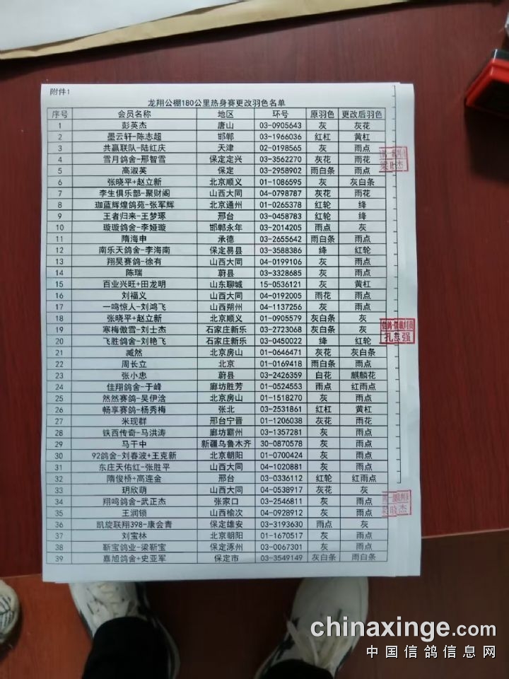 龙翔赛鸽公棚180公里热身赛更改羽色名单
