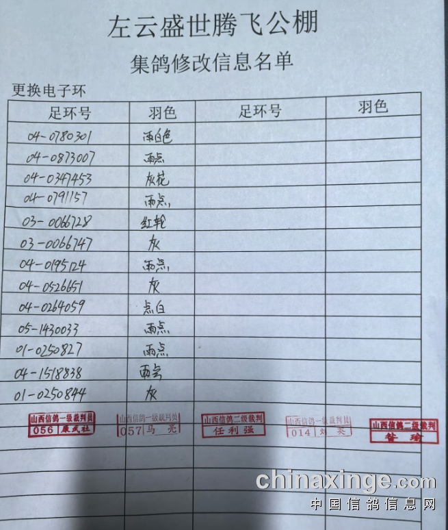 左云盛世腾飞公棚2025年加站赛集鸽修改信息名单