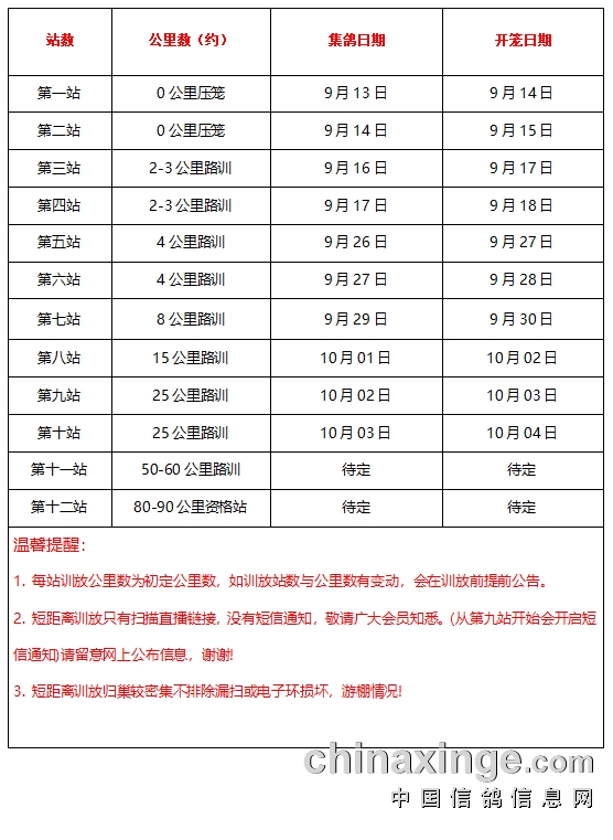 大家好!广东新时代宝玛(秋棚)第十站25公里训放定于10月3日晚集鸽,4日早上开笼!(如遇恶劣天气则改期另行通知!)