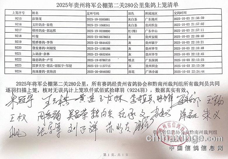 贵州将军公棚:2025年秋赛第二关280公里预赛逐羽上笼清单
