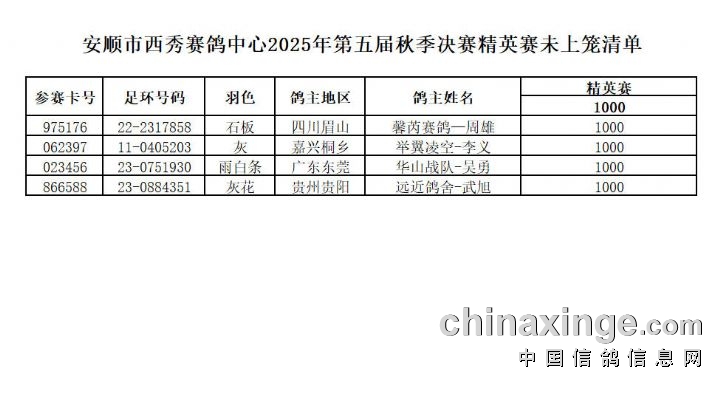 西秀赛鸽:2025年第五届秋赛决赛精英赛未上笼清单