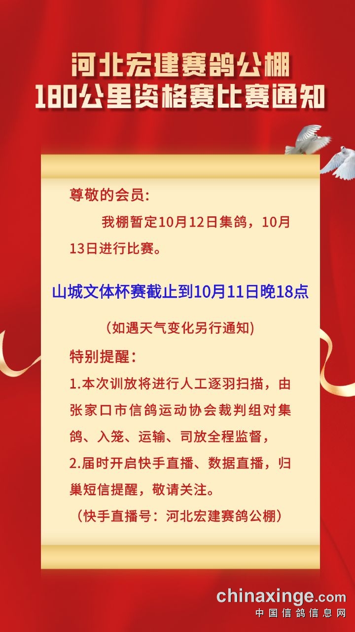 河北宏建赛鸽公棚180公里资格赛比赛通知