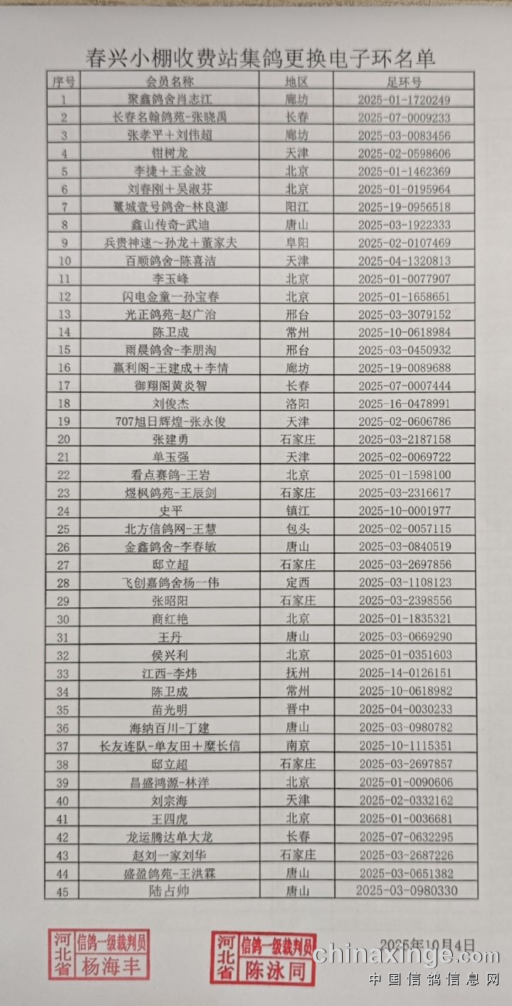 春兴国际(小棚)收费站2日归巢数据(按名次,不排除漏扫及电子环损坏等情况)