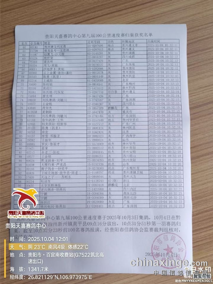 天喜公棚2025年:10月4日第十四次100公里速度赛训放影画
