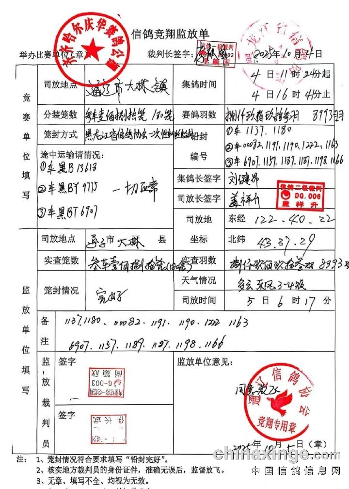 齐齐哈尔庆华公棚400公里信鸽协会监放单