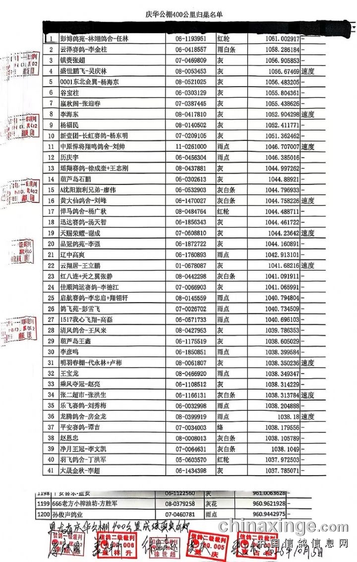 庆华公棚(秋棚)10月19日540公里加战赛归巢扫描网址