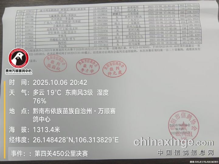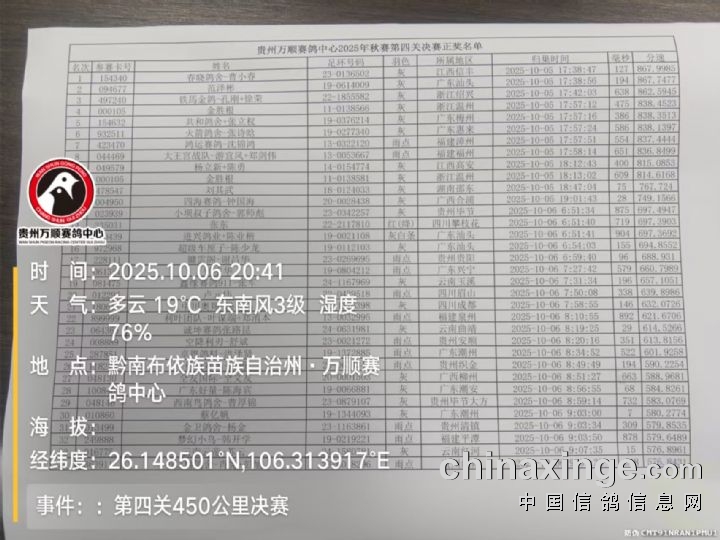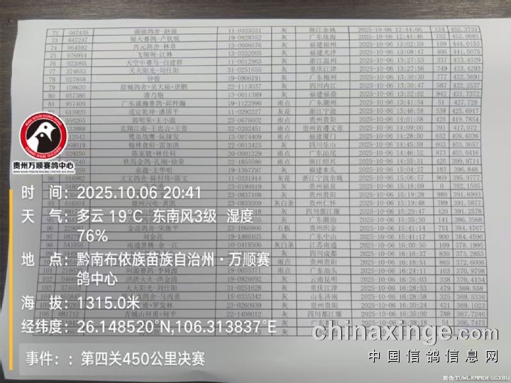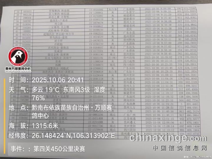 贵州万顺公棚:2025年秋赛第四关决赛(450公里)正奖名单