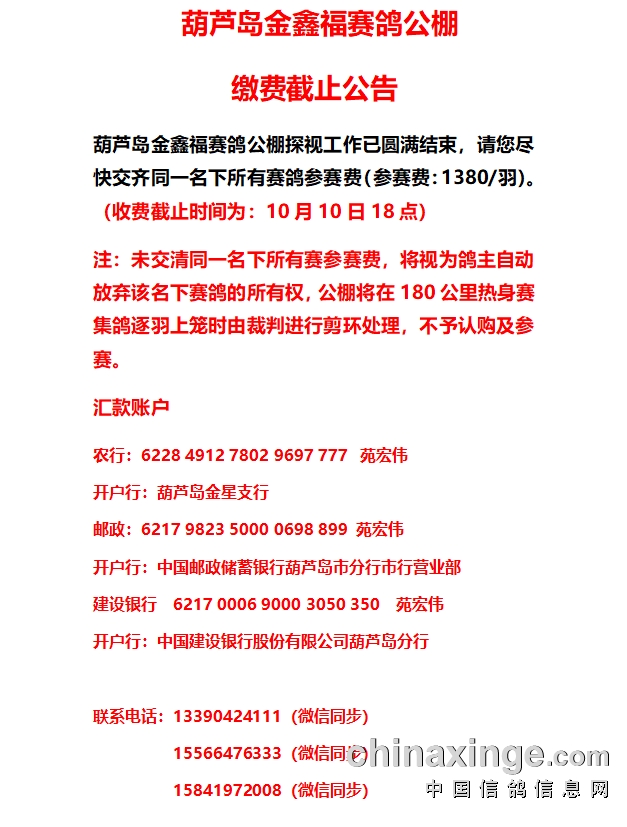 葫芦岛金鑫福赛鸽公棚缴费截止公告