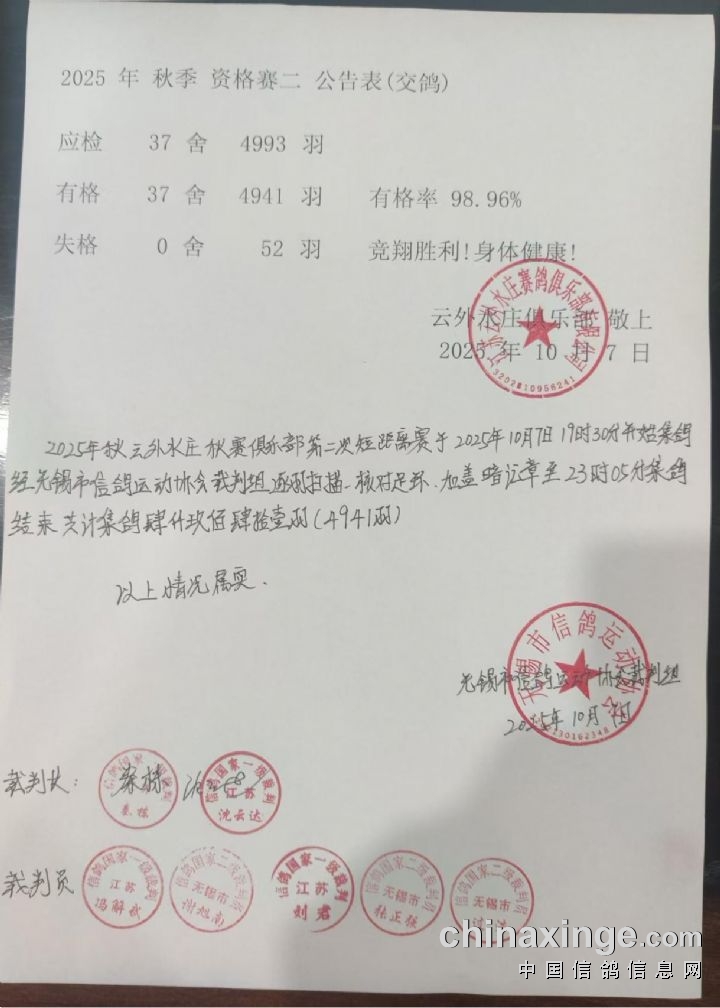 云外水庄赛鸽俱乐部第二次短距离赛于2025年10月7日晚19:30开始集鸽,经无锡市信鸽运动协会裁判组逐羽扫描核对羽色、足环并加盖暗记章于23时05分集鸽结束,共计集鸽肆仟玖佰肆拾壹羽(4941羽)。
