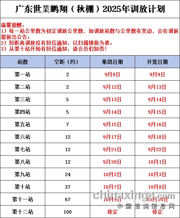 广东世業(秋棚)第十一站67公里训放定于2025年10月9日晚集鸽,10月10日早上开笼!如遇恶劣天气,则改期另行通知!