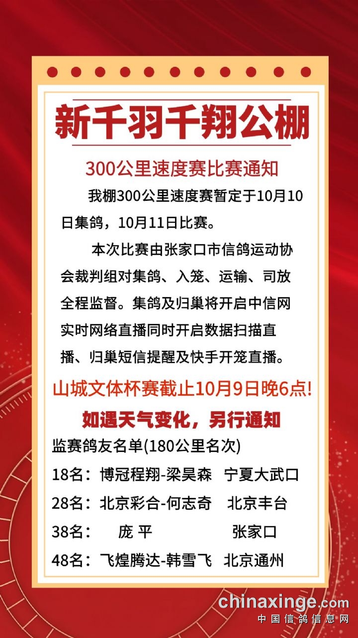 新千羽千翔公棚300公里速度赛更改羽色名单