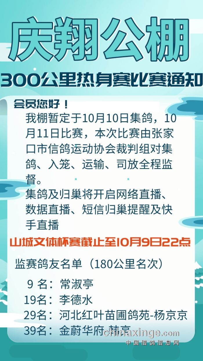 张家口庆翔公棚300公里热身赛比赛通知