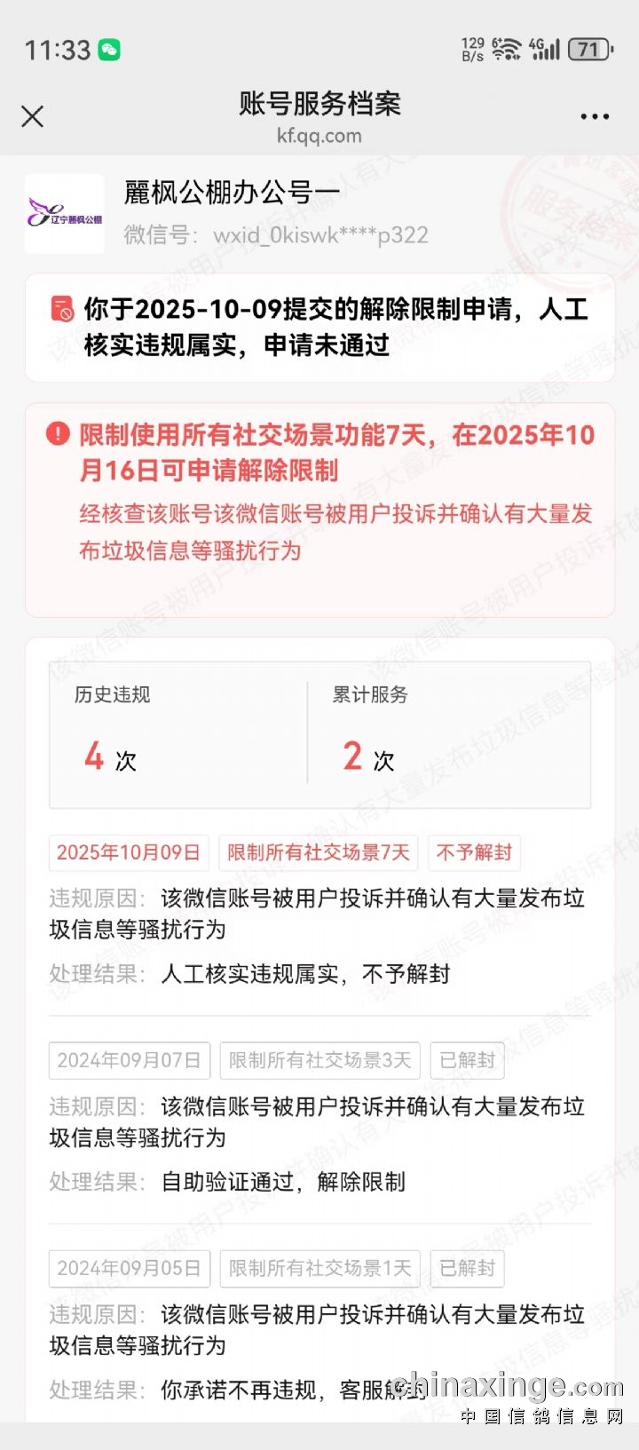 因麗枫办公号一微信封禁7天,所有消息不能回复, 朋友圈不能查看