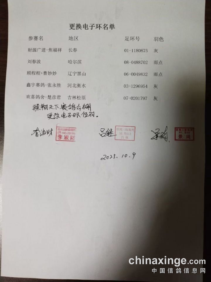臻翔公棚400公里更换电子环及更改羽色名单