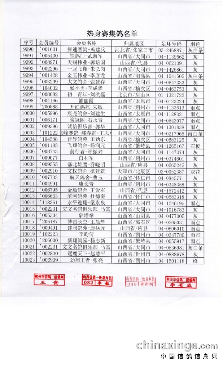 山西博翔赛鸽公棚第一关热身赛集鸽名单(按时间)