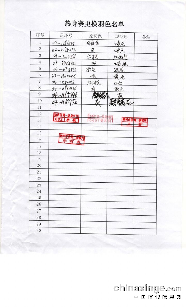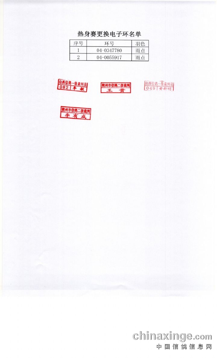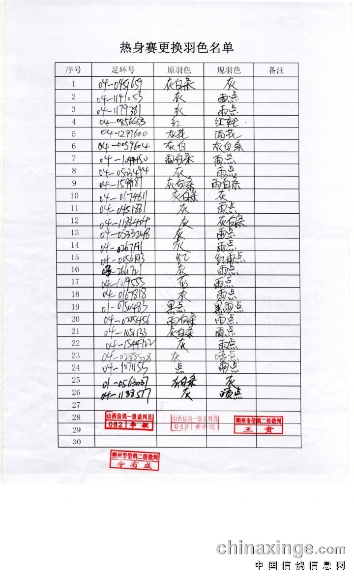 热身赛更改羽色、电子环及集鸽名单执行裁判签字确认