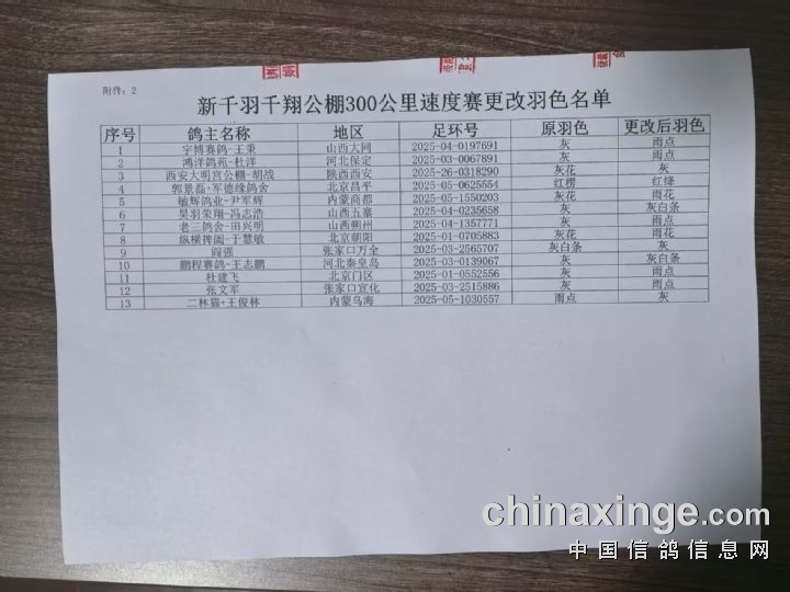 新千羽千翔公棚300公里速度赛更改羽色名单