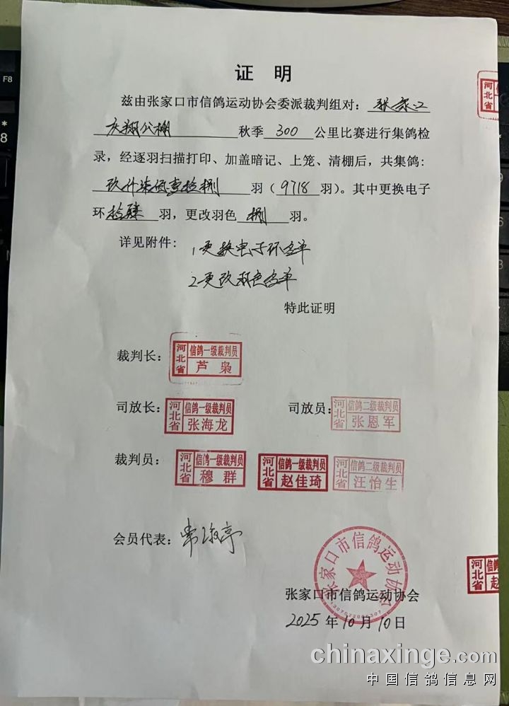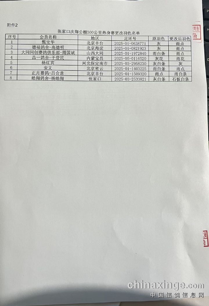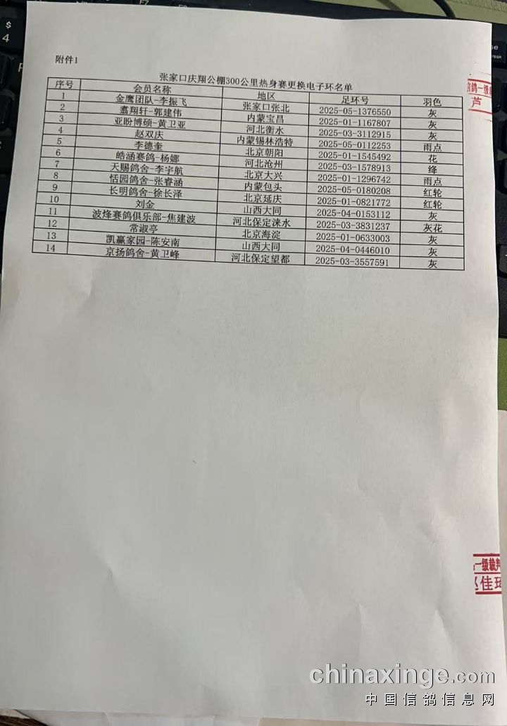 张家口庆翔公棚300公里热身赛更改羽色名单