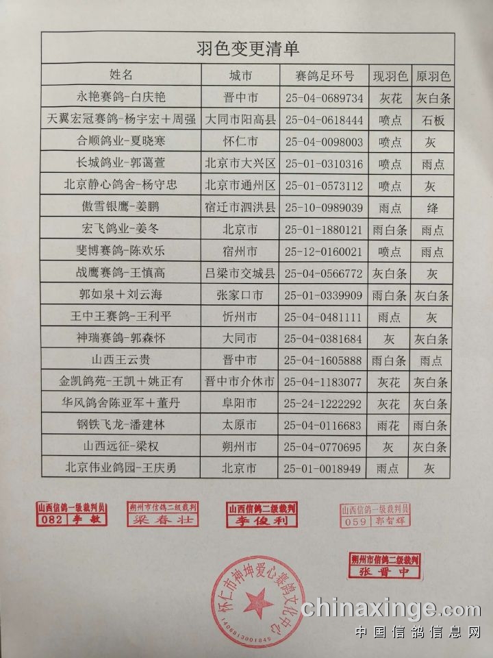 神齐国际赛鸽文化中心(公棚)资格赛羽色变更清单