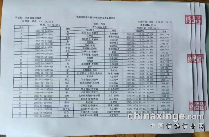 张家口庆翔公棚300公里热身赛集鸽数据(按时间)