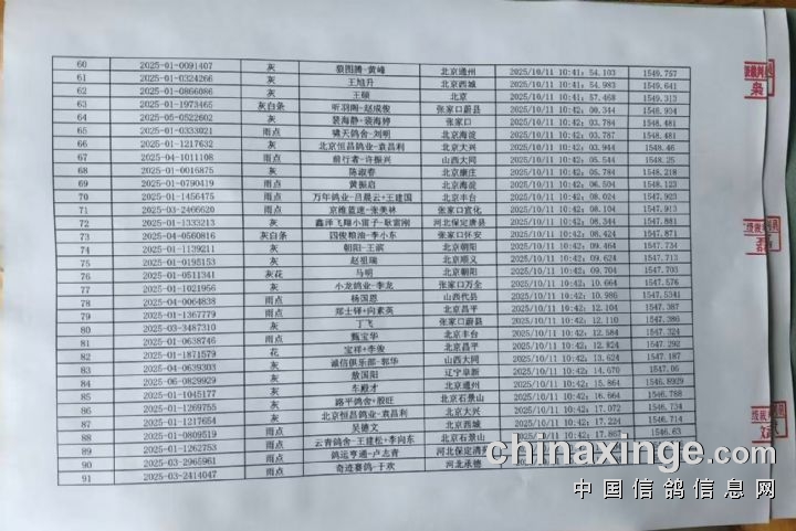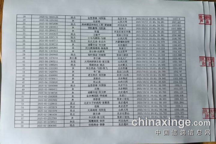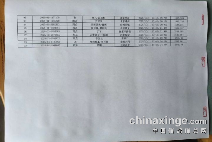 张家口庆翔公棚300公里热身赛前一百名录取名单