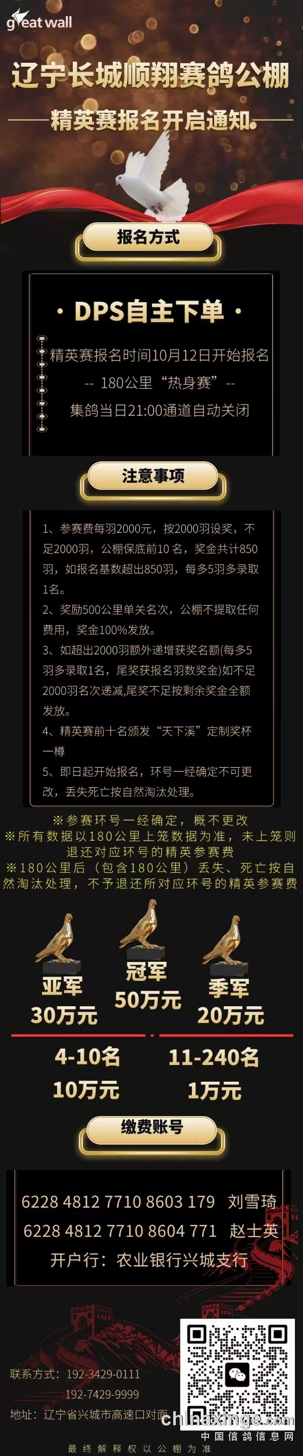 辽宁长城顺翔赛鸽公棚精英赛开启通知公告