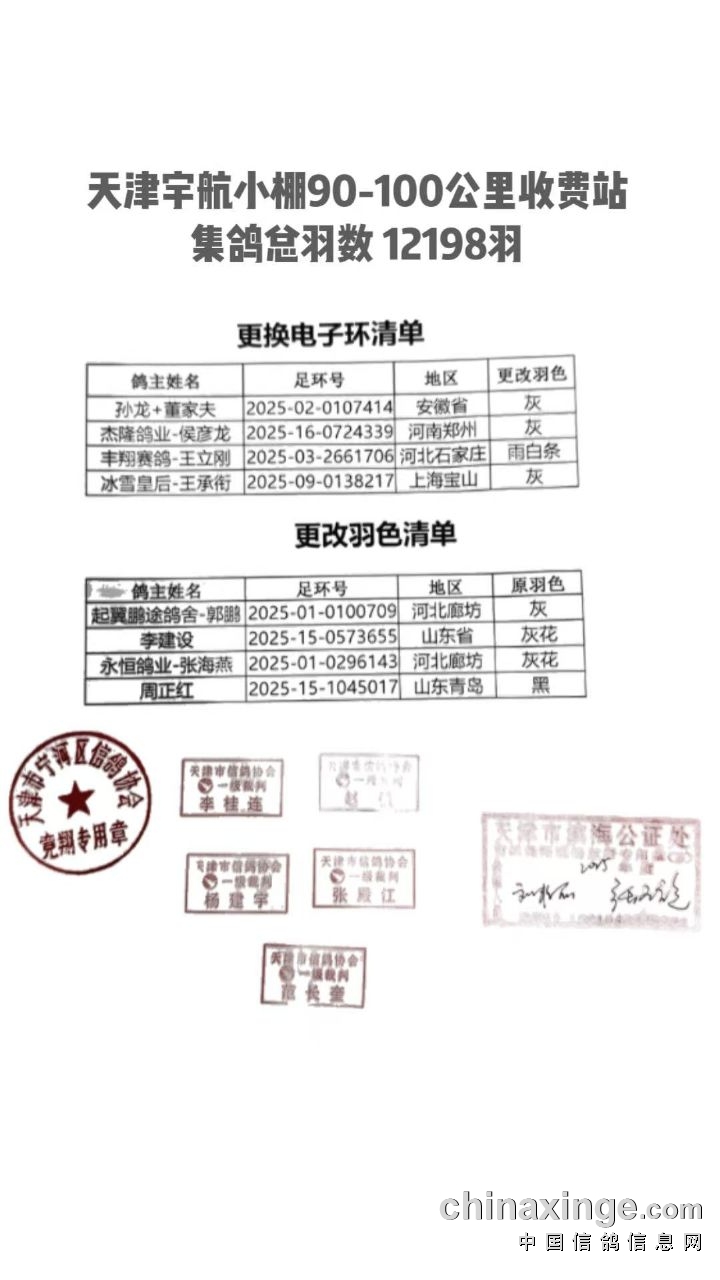 天津宇航小棚第二次92公里收费站手扫集鸽上笼清单