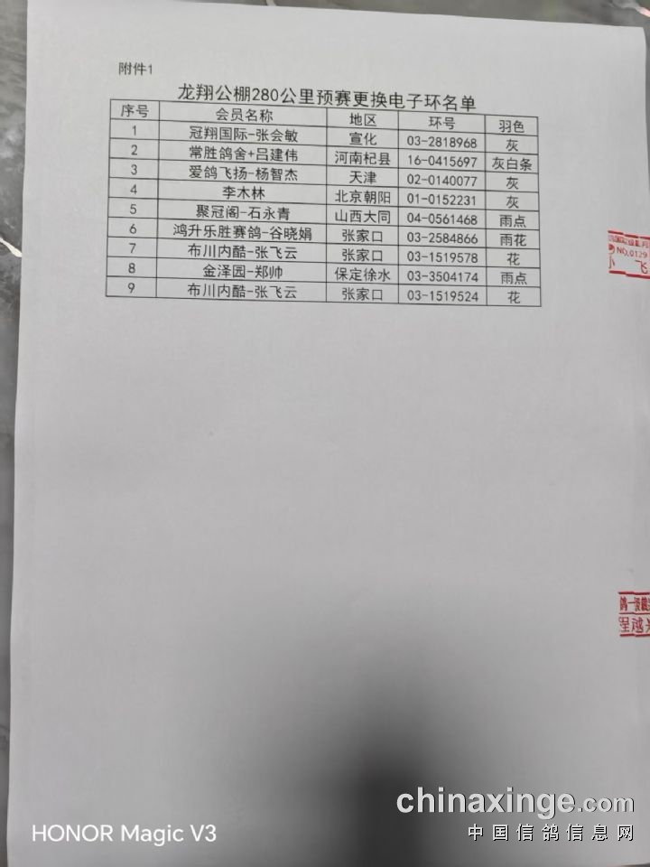 龙翔赛鸽公棚280公里预赛前200名成绩有效证明