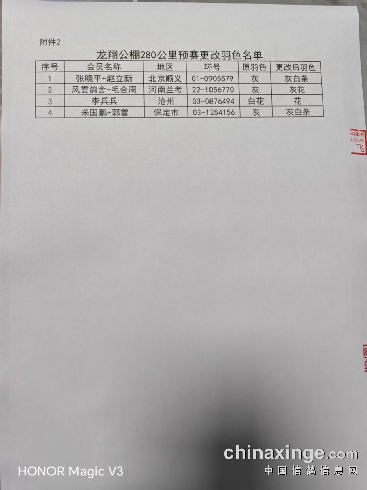 龙翔赛鸽公棚280公里预赛更改足环号码名单
