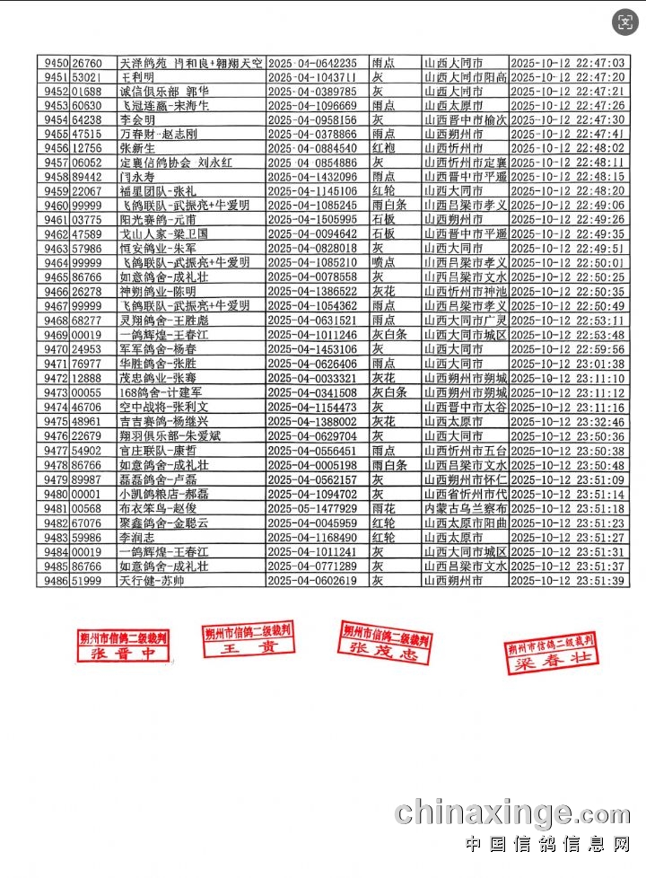 山西广武金翼公棚550公里集鸽上笼清单按地区