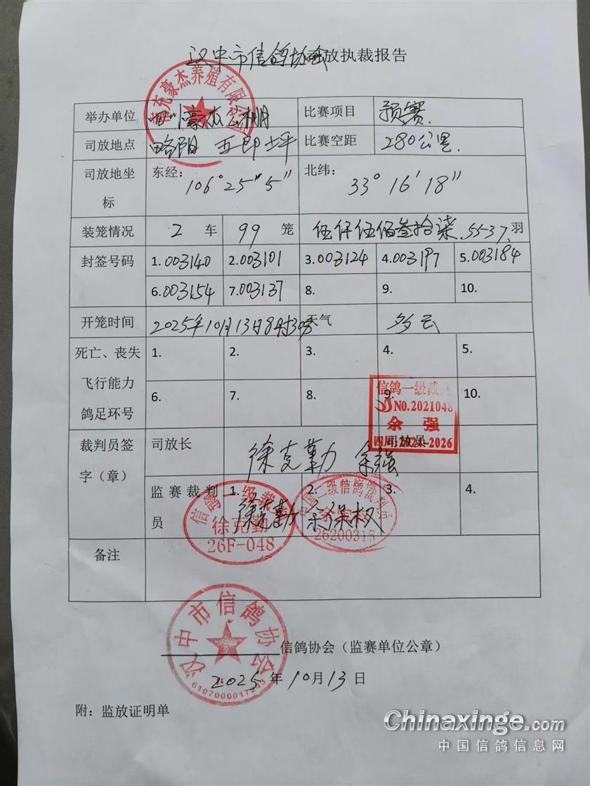 四川豪杰公棚第二关(预赛)汉中市鸽协执裁报告